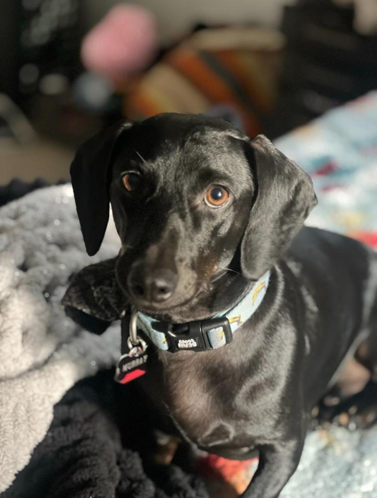 Pet Description:Black weenie dog. His name is Murray m. His collar is blue with bananas |