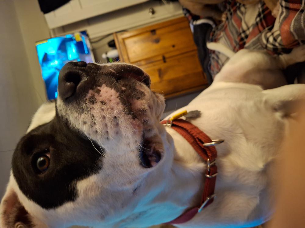 Pet Description:Large black and white dog wearing red collar. Microchipped |