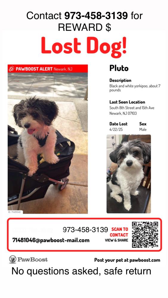 Pet Description:Contact 973-458-3139 for REWARD, no questions asked safe return!! Black & White, Male, 7lbs, name: Pluto Pluto was last seen on the corner of 15th Ave & South 9th Street, 4/22/25. #BringPlutoHome |