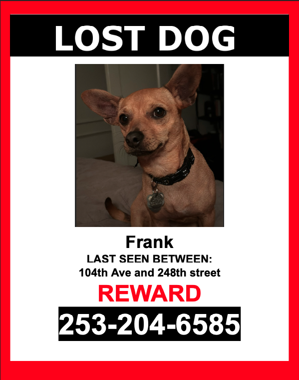 Pet Description:**MISSING SINCE 4/25/2025 AT 2pm**Frank is a Brown Chihuahua who escaped and was last seen between 104th Ave and 248th street. If you see Frank please DO NOT CHASE HIM. PLEASE CALL OR TEXT ONLY 253-204-6585 $$ Reward $$ |