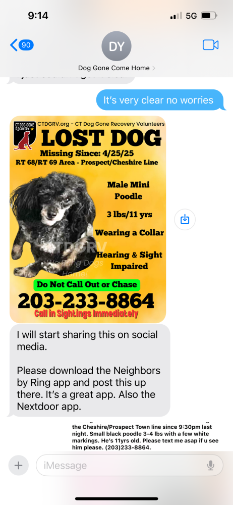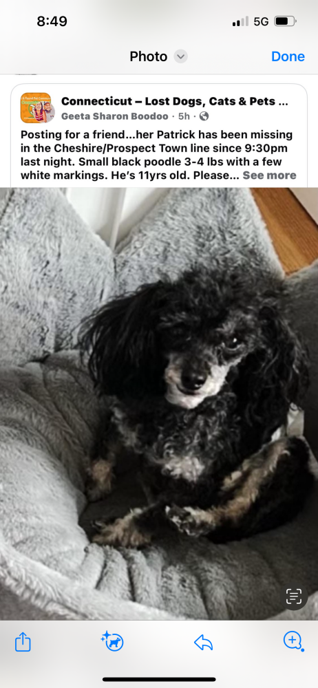 Pet Description:Black tiny poodle mix with white markings 11 years old . Sight and hearing impaired |