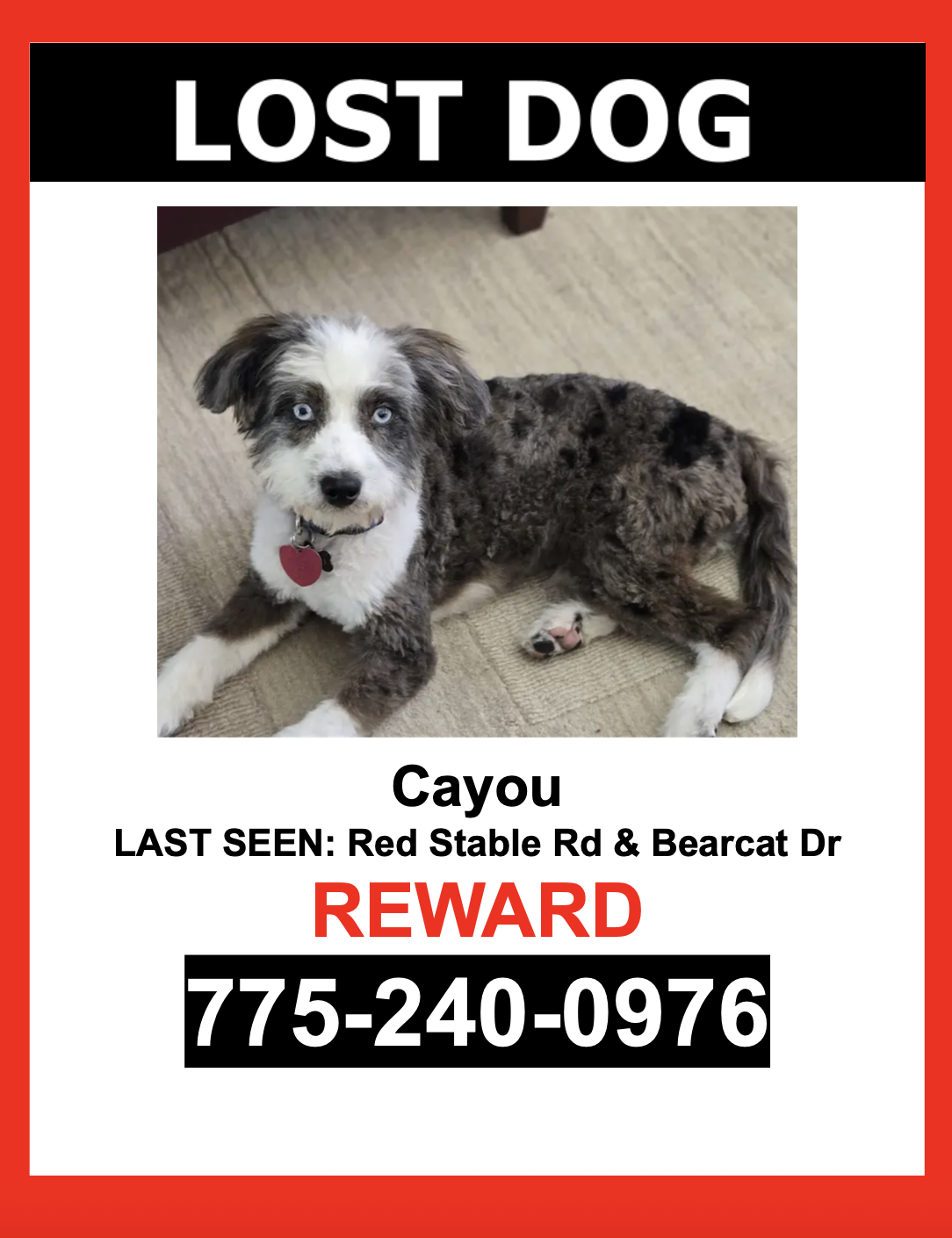Pet Description:**MISSING SINCE 4/30/2025 AT 3:00 PM**Cayou is a male, merle with white features, Australian Shepherd & Poodle mix who escaped and was last seen near Red Stable Rd & Bearcat Dr.Cayou is wearing his collar with tags, a harness, and a vest and is microchipped.If you see Cayou please DO NOT CHASE HIM.PLEASE CALL OR TEXT ONLY.775-240-0976$$ Reward $$ |