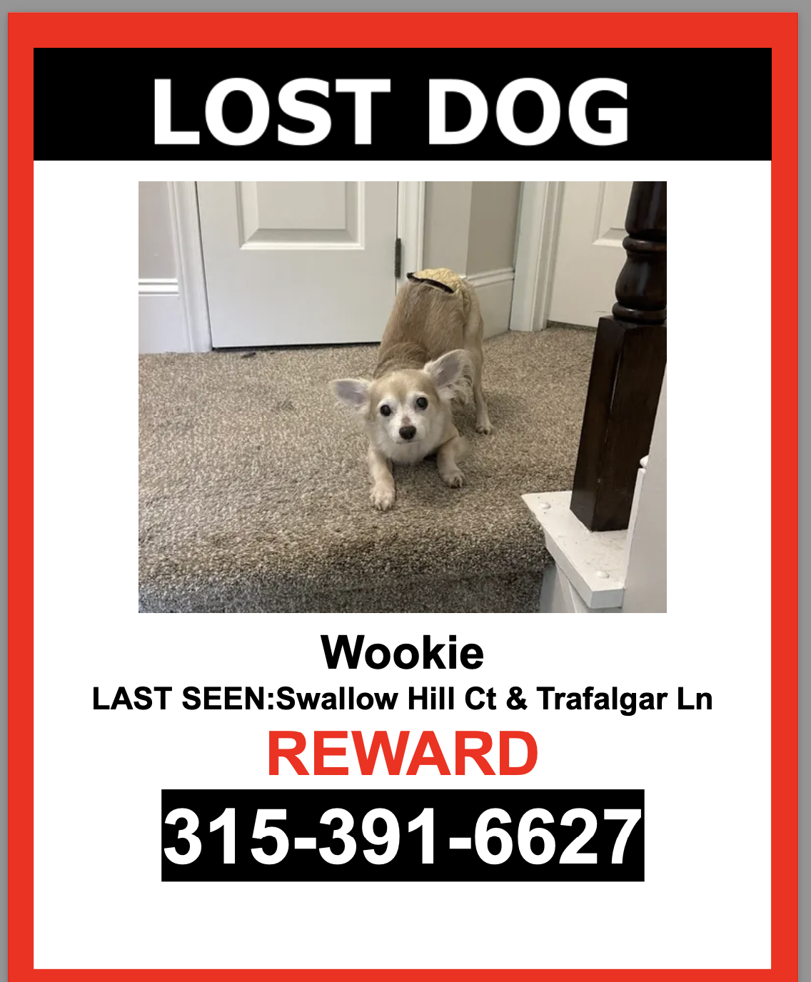 Pet Description:MISSING SINCE 5/3/25 AT 12:30 PMWookie is a Male, Gold Chihuahua who escaped and was last seen near Swallow Hill Ct & Trafalgar LnWookie is wearing no collar tags and IS microchipped.If you see Wookie please DO NOT CHASE HIM.PLEASE CALL OR TEXT ONLY.315-391-6627$$ Reward $$ |