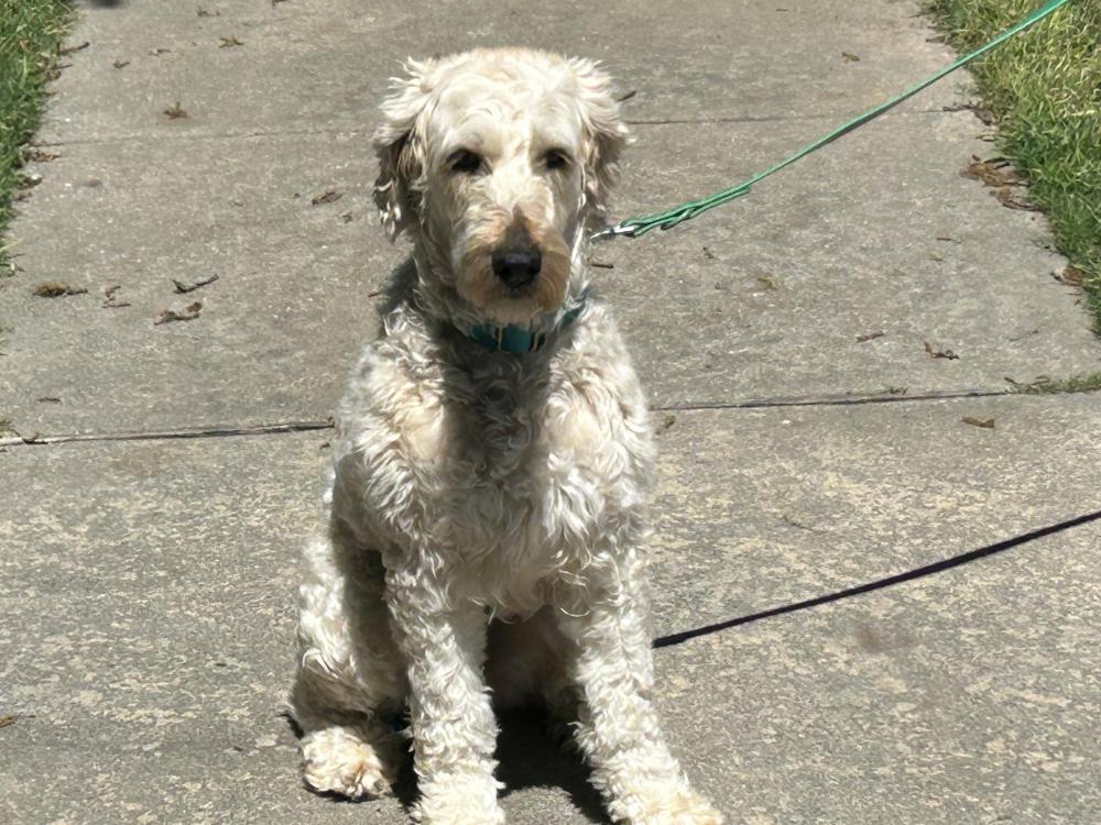Pet Description:Maple is a 36-pound creamish poodle mix microchipped with a blueish green collar on with doodle rock ID tags. |