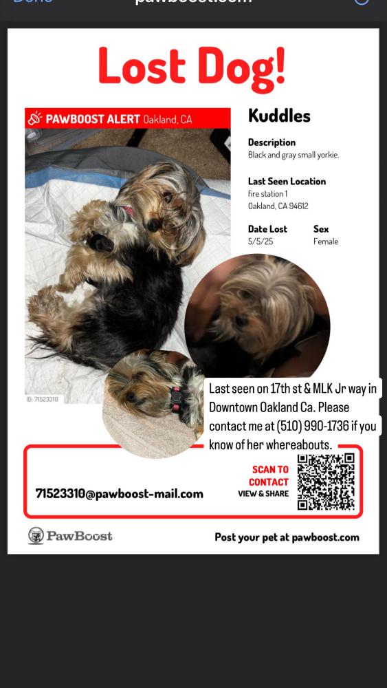Pet Description:A miniature Yorkie with black and gray, she is a timid but sweet dog. She has a small quiet bark at times. She will hide and cower from others but loves her tummy rubbed. May have some matted hair from her recently having a litter that was nursing on her. She somewhat looks like a lemur in the face but is the cutest with a crooked smile. She is not wearing a collar & does not have a microchip. |