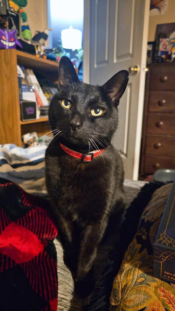 Pet Description:Short back hair, yellowy eyes, blue collar that has a bell, sweetest cat ever. Has a rough and raspy meow. |