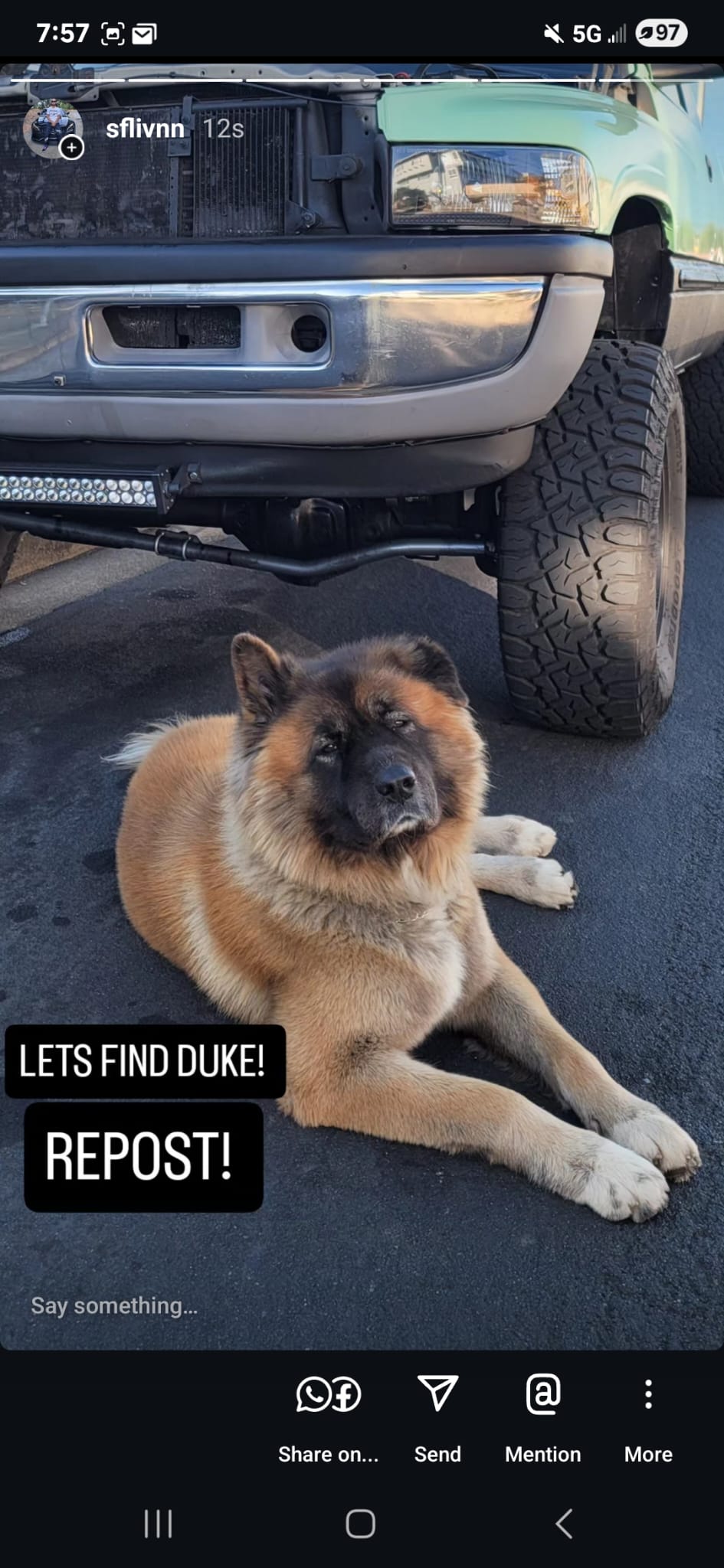Pet Description:Duke is a service dog and he is a big bear.Look alike fat face with black in the middle. If you are.Afraid to go up to him.You can just call me.Our family misses him.We will try to compensate much much appreciated God bless |