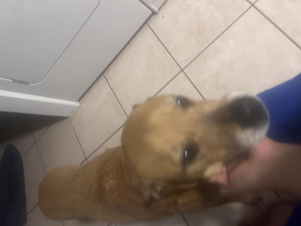 Pet Description:Brown lab mixed pink coller with a bone tag |