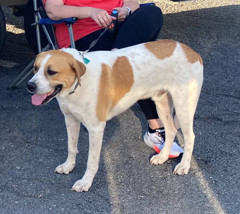 Pet Description:White with brown spots large dog, probably 85 lbs. Wearing a blue collar with tags and our phone number. |