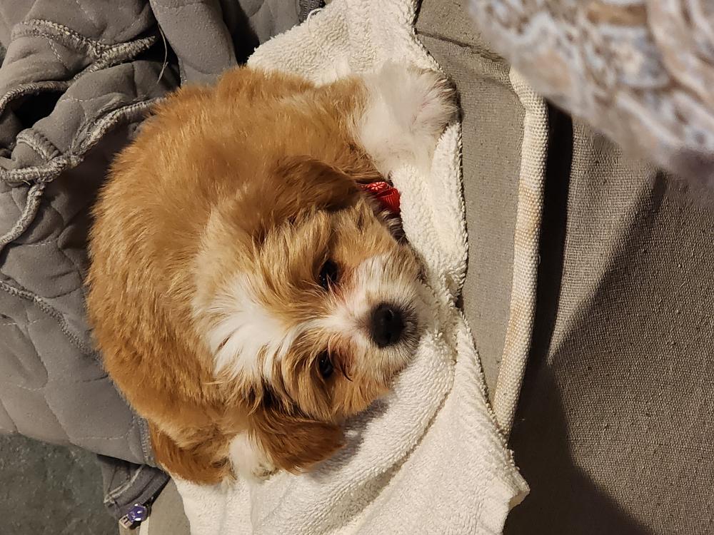 Pet Description:Es color un poco oscuro cafe con patitas blancas es esponjoso, es un popi pequeno |