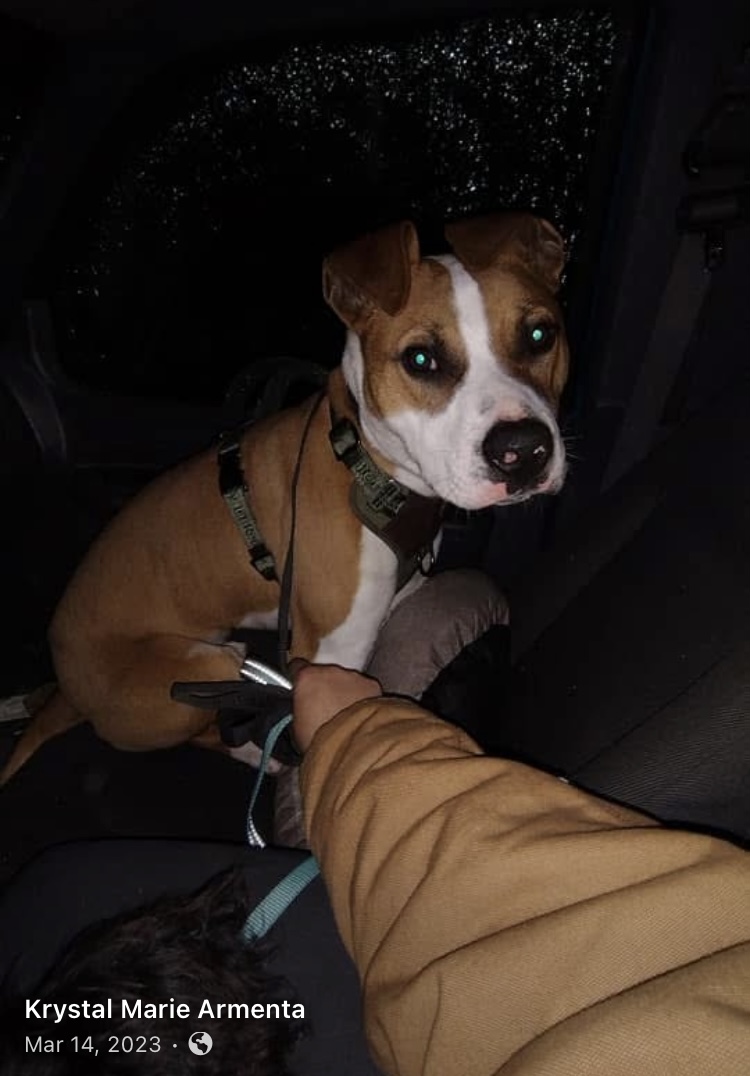 Pet Description:He’s a fawn and white color with a little bit of black on his face like freckles in a way underneath the white. He has a dark green harness and collar on. |