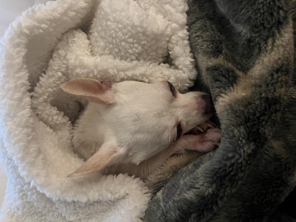 Pet Description:Small white chihuahua found by my dumpsters with big meat bone in her mouth she was trying to walk off into the roads but took her in hoping to find her family |