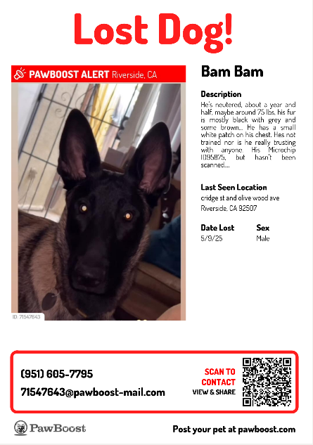Pet Description:He's a 1 year and 3 month old Belgian Malinois PLEASE if anyone has additional info don't hesitate to hit me up or even call if its necessary @ 951-206-2397 This post is the last update I've come across and it shows them near a Carl's Jr on arlington and van buren |