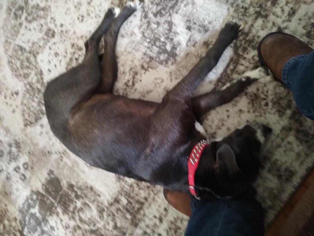 Pet Description:Mixed breed female, wearing a red collar. White toes, grey/blue body, white blaze and chest. |