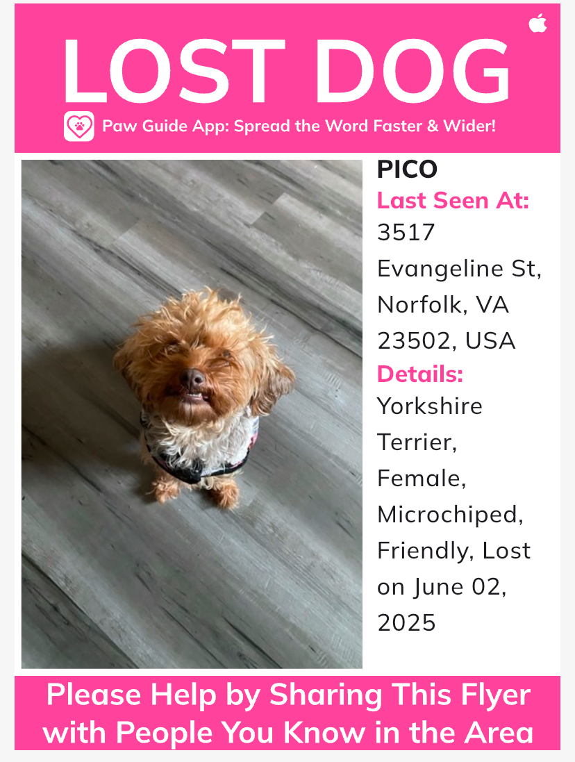 Pet Description:She’s a smaller dog, brown curly hair, around 7 years old. Her name is Pico super friendly and will come to you easily. |