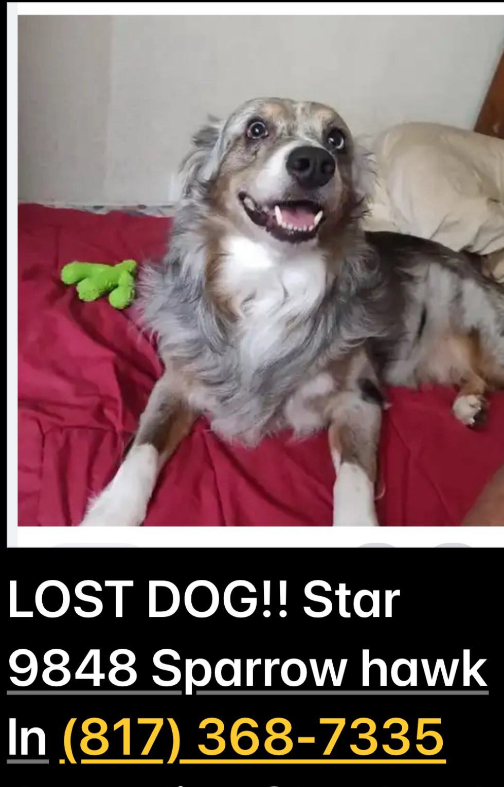 Pet Description:Star is a 10 year old male, Australian Shepherd, white gray and brindle. He is a complete house dog very very shy escape through the back fence. |