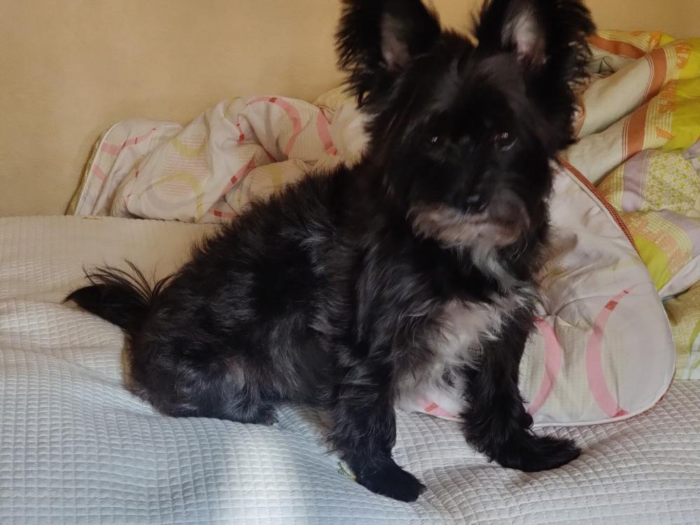 Pet Description:Black with white fur in the bottom and pointy big ears |