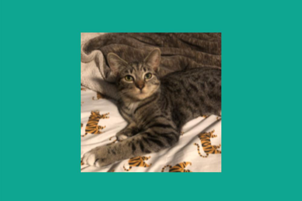 Pet Description:Grey and brown Tabby very friendly and playful on the smaller side, with yellow eyes and long pointed ears. Female. |