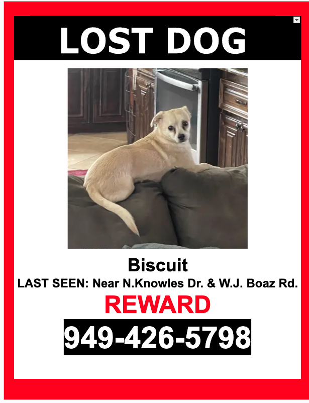 Pet Description:**MISSING SINCE 06/10/2025 AT 6:00 AM**Biscuit is a Male, TAN, Chihuahua & Rat Terrier who escaped and was last seen near N. Knowles Dr. & W.J. Boaz Rd.BISCUIT is not wearing a COLLAR And IS microchipped.If you see BISCUIT please DO NOT CHASE HIM.PLEASE CALL OR TEXT ONLY.949-426-5798$$ Reward $$ |