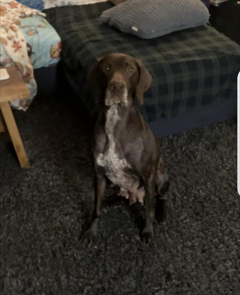 Pet Description:Medium height friendly pink collar white spots on her chest |