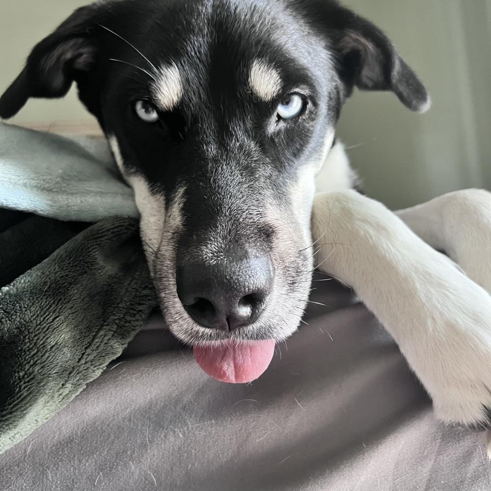 Pet Description:Usagi is a mix breed between a Siberian husky and a black lab. She has a super long tongue and white socks pattern on her paws. |