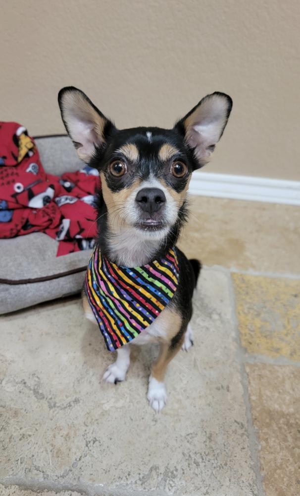 Pet Description:Small black and brown chihuahua with white socks and markings. Weighs about 8lbs and has brown eyes. |