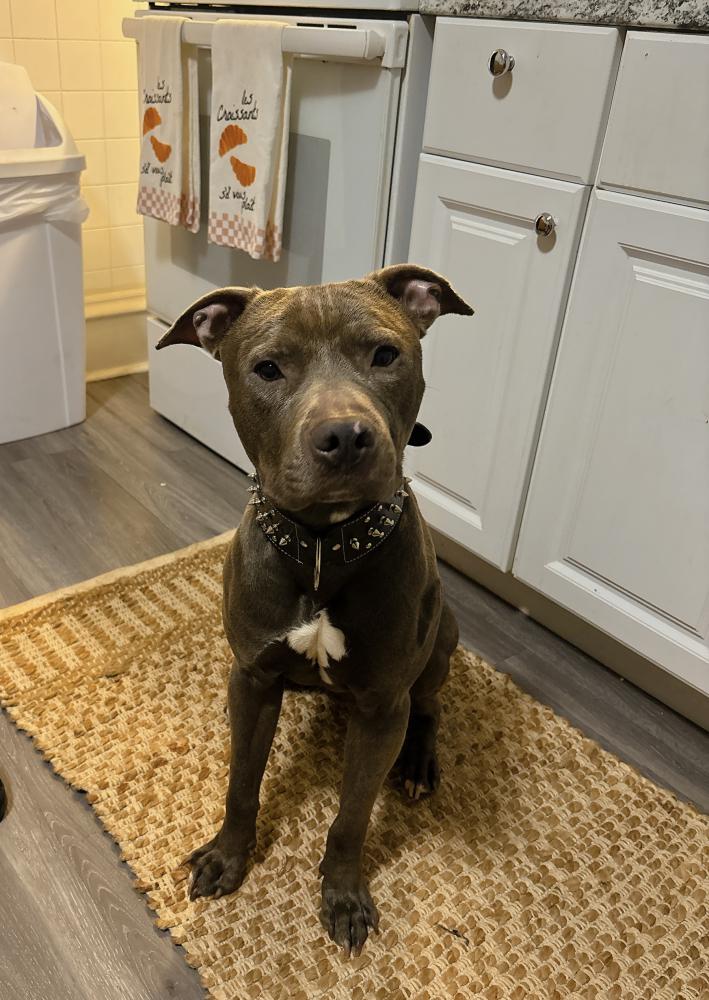Pet Description:2 year old grey pitbull with white patch on chest, little mark on his nose, no collar and very friendly. |