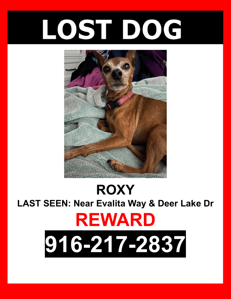 Pet Description:Body**MISSING SINCE 06/19/2025**ROXY is a FEMALE, BROWN / WHITE FACE, MINI PINSCHER who escaped and was last seen near Evalita Way & Deer Lake Dr.ROXY is wearing HER COLLAR and IS microchipped.If you see ROXY please DO NOT CHASE HER.PLEASE CALL OR TEXT ONLY.916-217-2837$$ Reward $$ |