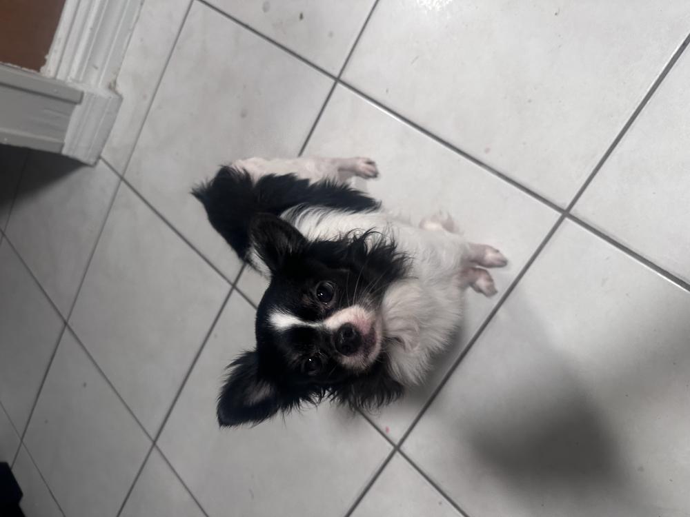 Pet Description:Black and white white mark crooked along the face long haired chihuahua please help he’s a good boy blue collar |