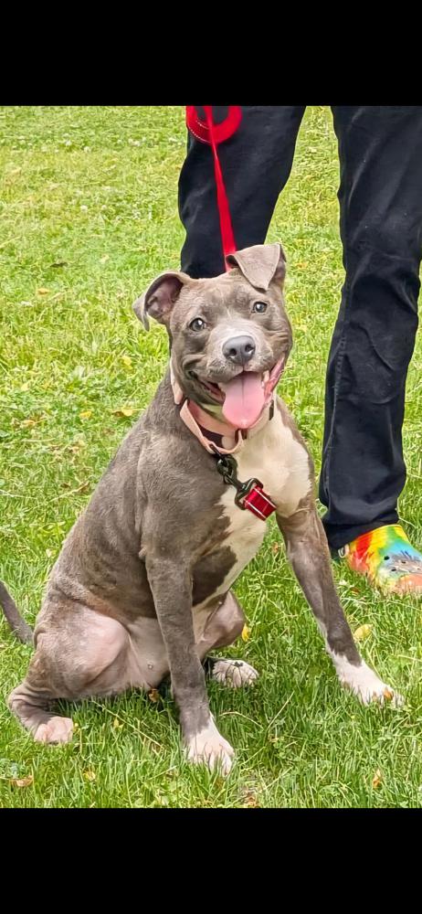 Pet Description:GREY and white belly with white pawd medium sized female terrier mix with recent incision on stomach. |