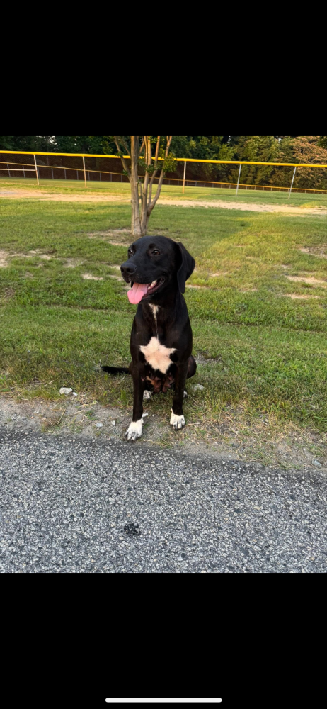 Pet Description:Black lab/pointer mix breed. Black with white paws, chest, and belly. Has had atleast 1 litter of puppies, not sure how recent. She is currently in heat. No chip. |