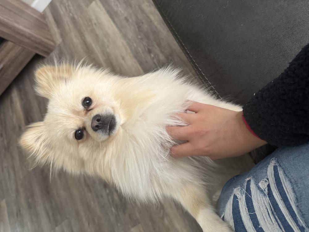 Pet Description:Small white and tan Pomeranian, he is wearing a bright neon orange harness |