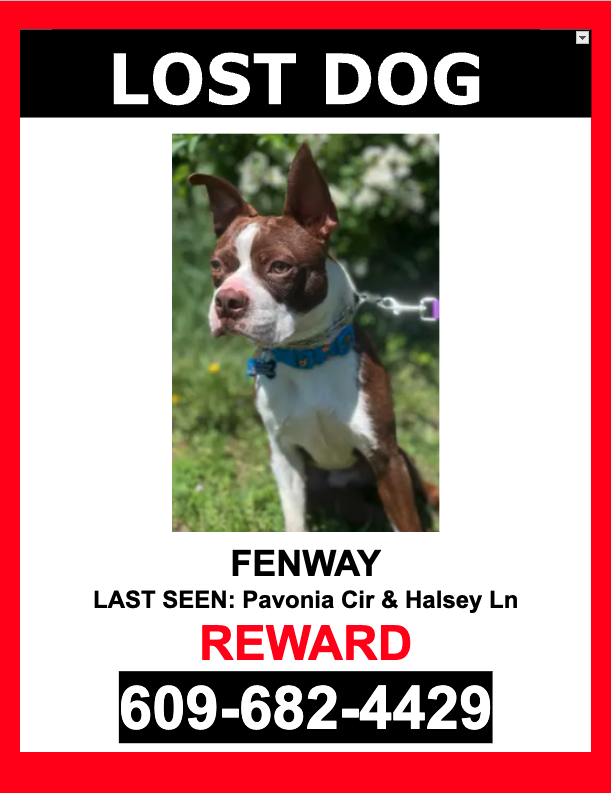 Pet Description:FENWAY is a male who escaped and was last seen near Pavonia Cir & Halsey Ln. FENWAY is NOT wearing a COLLAR and IS microchipped. If you see FENWAY please DO NOT CHASE HIM. PLEASE CALL OR TEXT ONLY 609-682-4429.**REWARD** |
