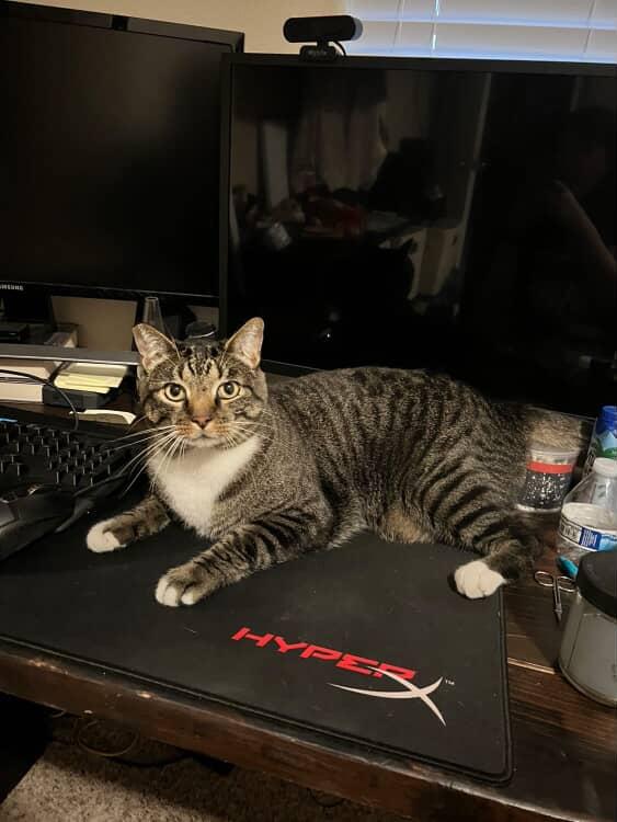 Pet Description:Mostly grey with black strips. Has white chest and white paws. barely any white on his left paw and he has a slightly cut off right ear. |
