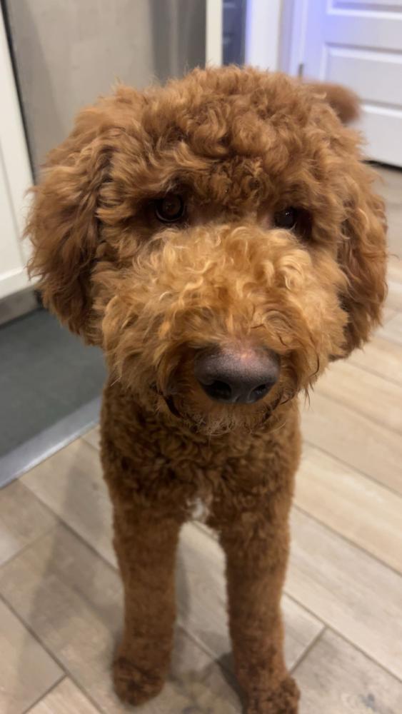 Pet Description:Medium size goldendoodle, brown with a white stripe on chest. He doesn’t have his collar on and is not microchipped. He’s not neutered either. He’s 1 years old now. He recently got a haircut and is shaven. He does bark a lot and likes to play. |
