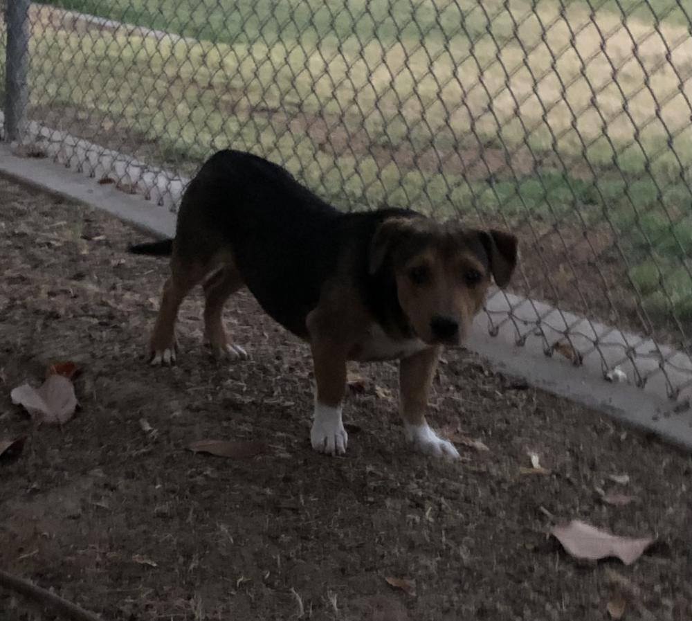 Pet Description:Medum to large-sized dog; mixed breed: black with brown face and legs; White socks and white on chest: long body |