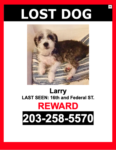 Pet Description:LOST PET - BLACK & WHITE /POODLE Mix / MALE - $$ Reward $$ MISSING SINCE 07/05/2025 AT 5:00 PM. LARRY is a MALE, BLACK & WHITE, POODLE MIX who escaped and was last seen near 16TH AND FEDERAL ST.LARRY is wearing HIS COLLAR with tags and IS microchipped.If you see LARRY please DO NOT CHASE HIM.PLEASE CALL OR TEXT ONLY.+203-258-5570$$ Reward $$ |