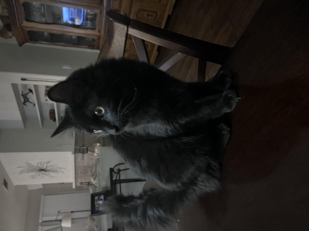 Pet Description:Small female black medium silky hair cat, less than one year old. Not chipped, has yellow eyes. Was last seen wearing a yellow collar with flowers on it. Is skittish and will not usually come up to strangers. |