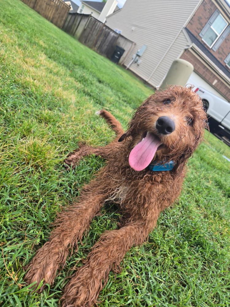 Pet Description:Reptar is a 9-month-old, 35-lb Brittany Doodle. His hair is now shorter now than in the photo attached. He's wearing a harness and a red and black checkered collar with a rabies tag on it. |