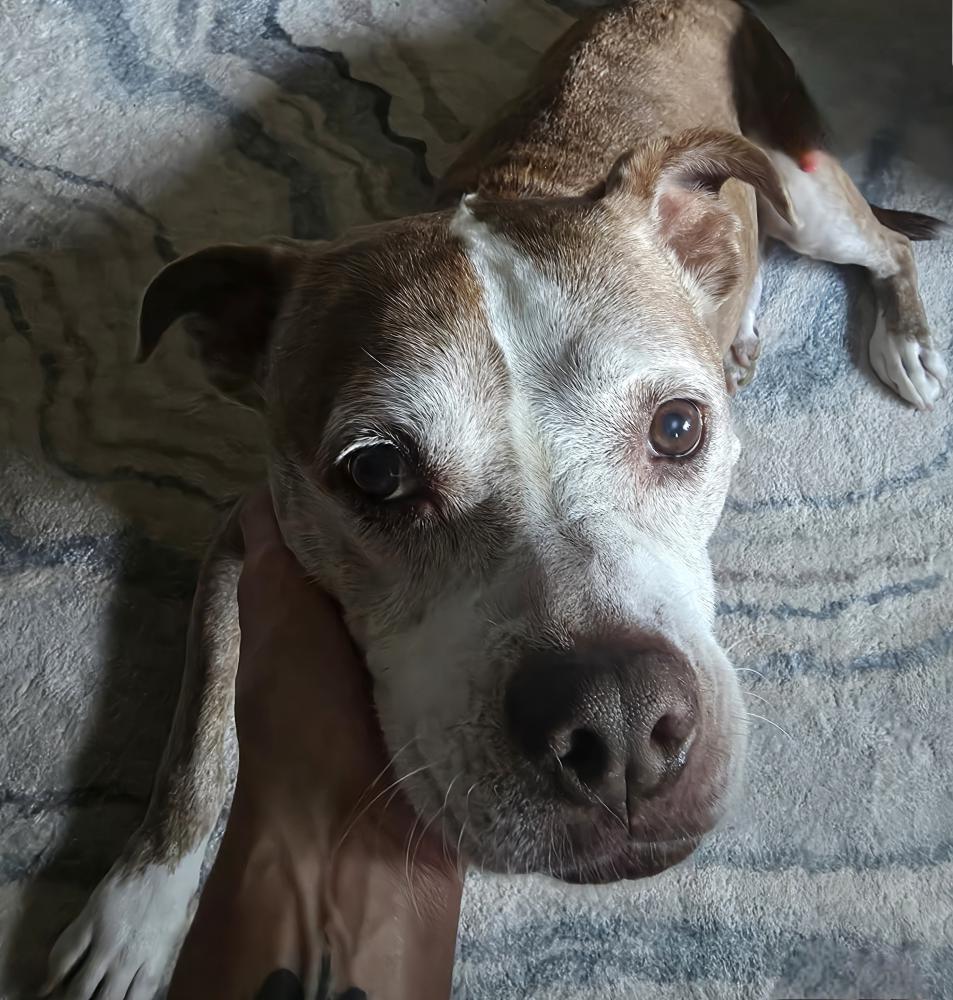 Pet Description:50lb, female Pitt Bull bulldog mix. 14yo, partially deaf. Very friendly. Is microchipped but it migrated to her shoulder. Has some dementia. |