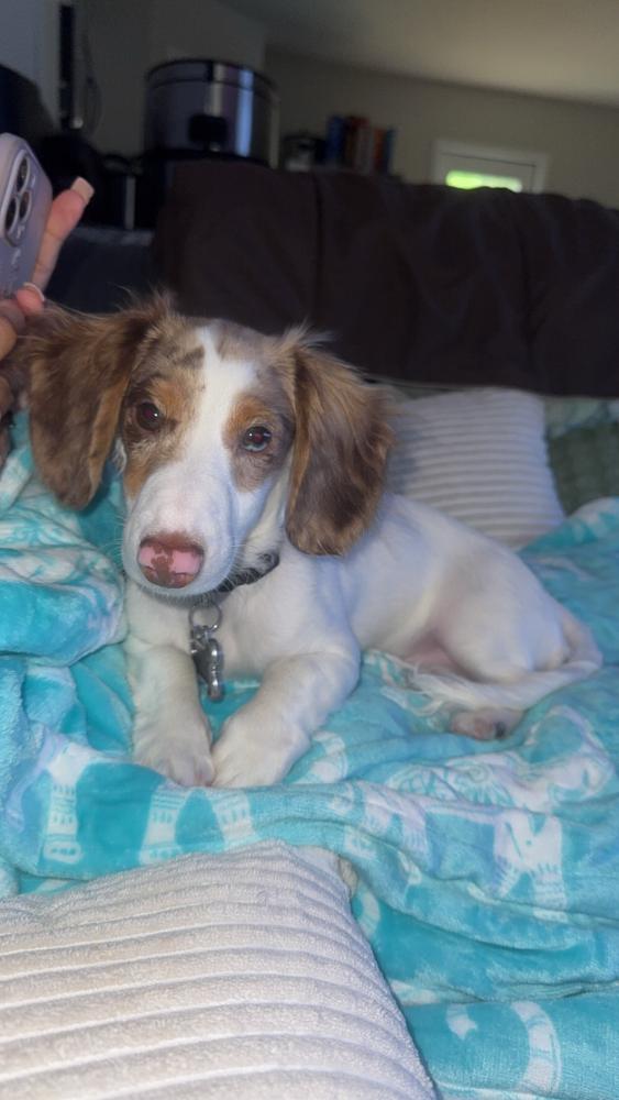 Pet Description:He is white with 2 brown spots on his back. He had brown eyes 1 half blue. Dapple color face |