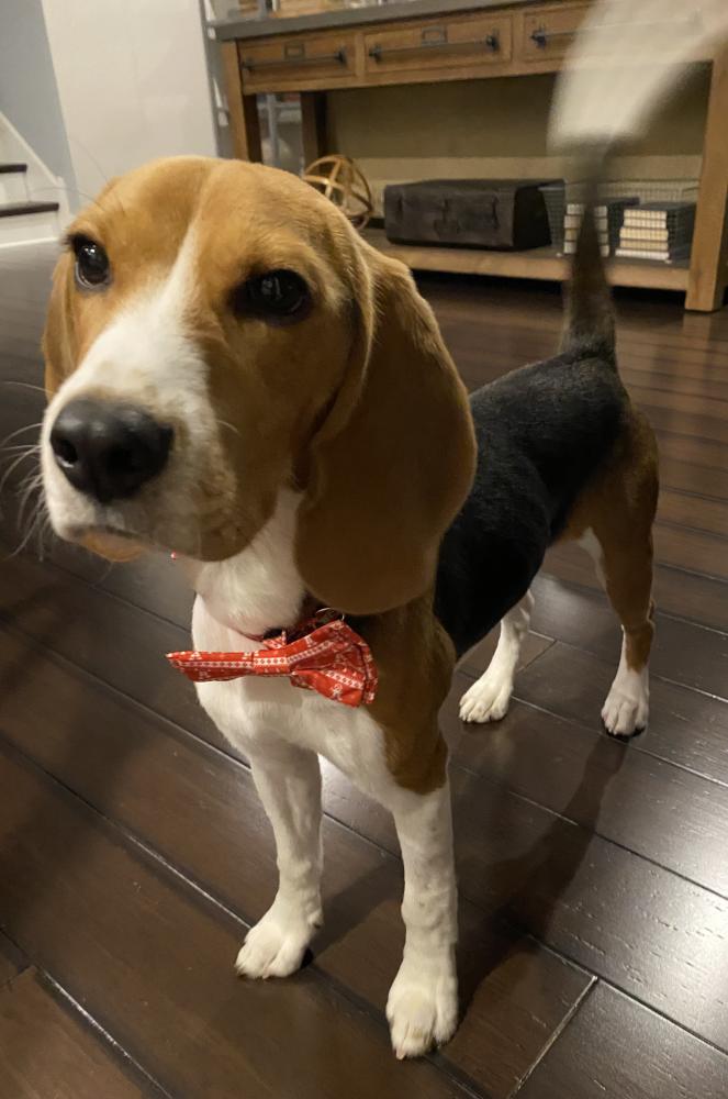 Pet Description:Tri color beagle ( black, brown and white)He is 1 year old. He is wearing a collar with a red leash attached. |