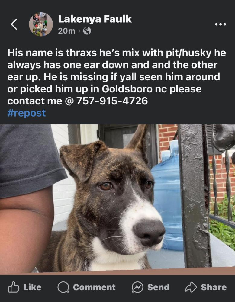 Pet Description:One ear that sticks up and the other doesn’t he’s friendly and loving and have beautiful brown eyes. |
