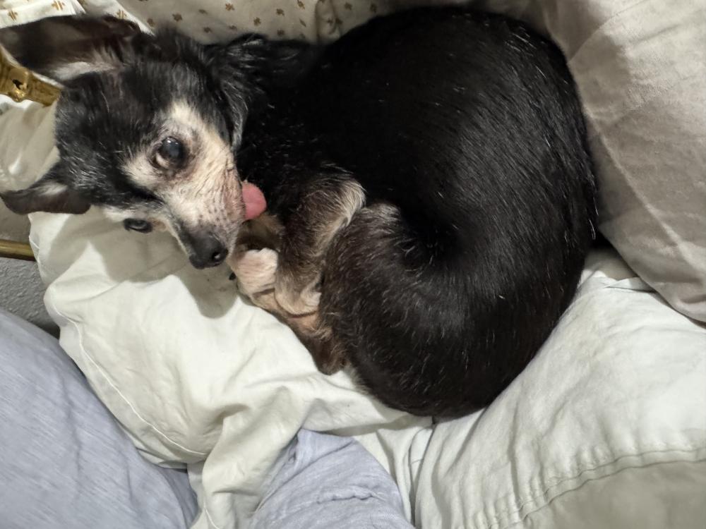 Pet Description:Black/white older female chihuahua with her tongue sticking out. |