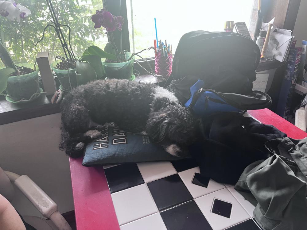 Pet Description:Small curly haired poodle mix, very friendly and barks, white socks and black and white coat. |