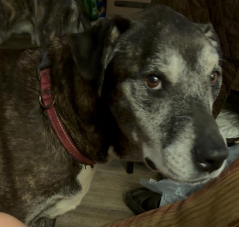 Pet Description:Black, brown, and white Plott hound, brindle fur, wearing pink collar, has a lightning bolt shaped patch of white fur on the back of her neck, around 50 pounds, medium sized dog |