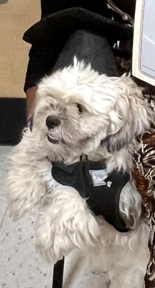 Pet Description:London is a small dog with curly type hair when not cut, white colored with some grayish/brownish highlights. |