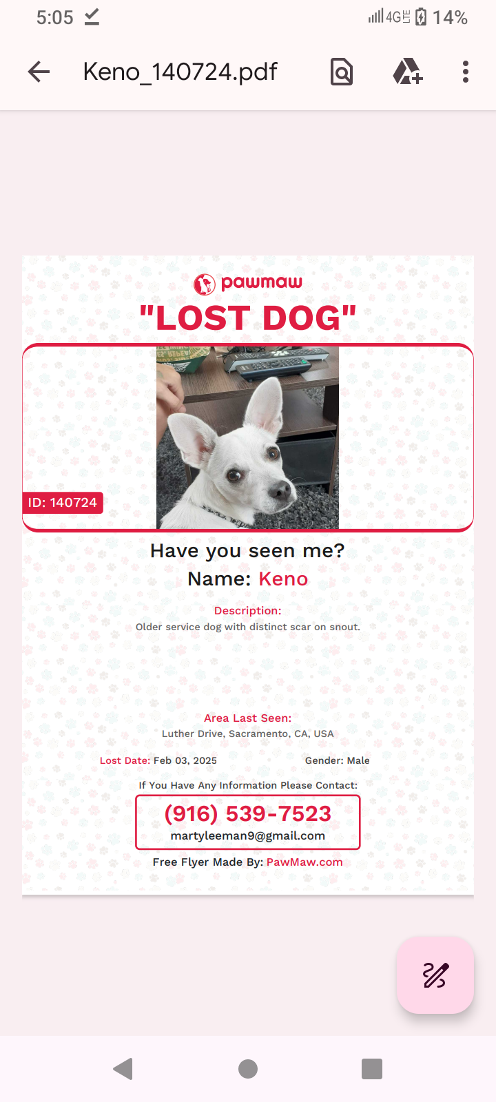 Pet Description:White older male scare on snout. Keyno is my service dog I'm all he has had for his whole life since he first opened his eyes 9 years ago. He was old 2 1/2 weeks old when I found him. Were all each other has please I'll do anything just for him to be in my arms again. |
