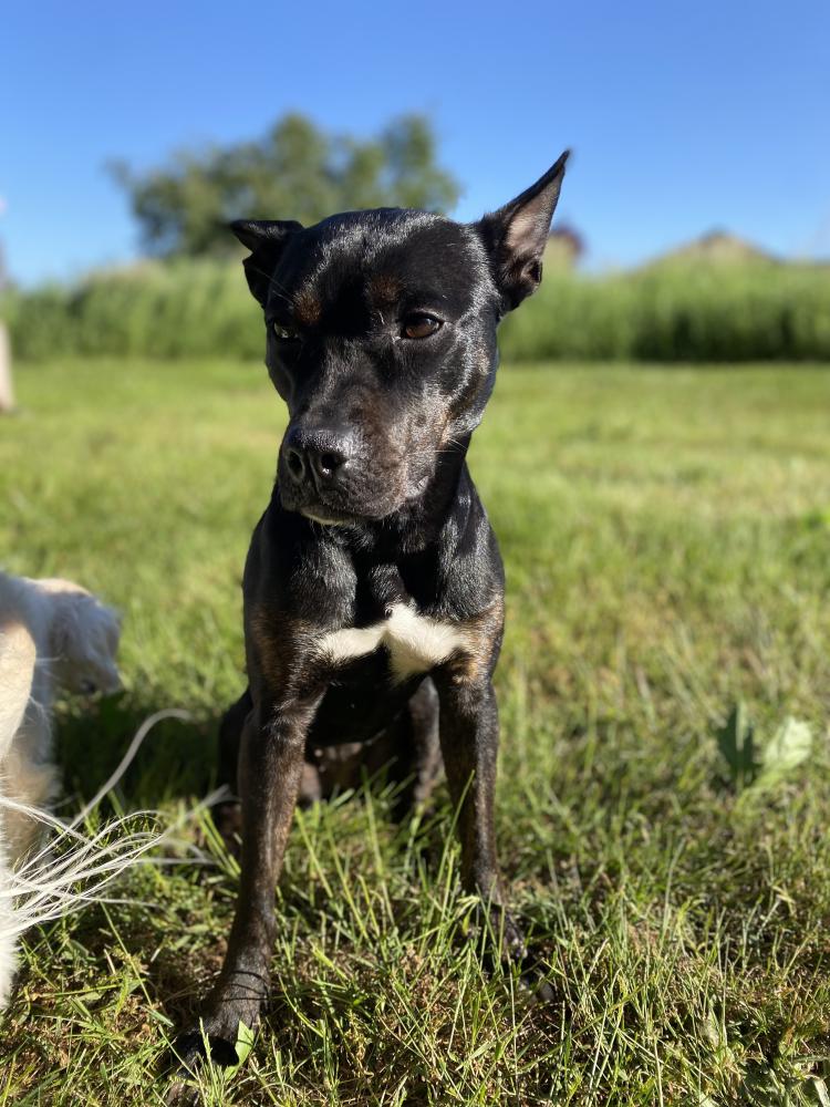 Pet Description:5 years old, extremely friendly, white spot on her chest and brindle patterns up the legs. chipped as well. |