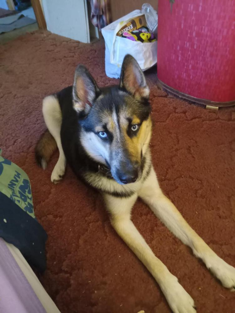 Pet Description:Bear is a 2 year old very friendly German shepherd/husky mix with the shepherd coat and husky blue eyes he short haired and medium sized |